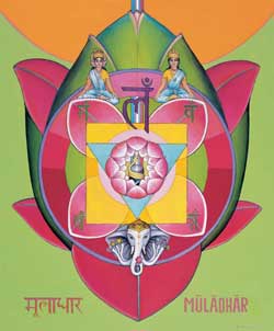 Muladhara Chakra este situată la baza coccisului. Aceasta este prima dintre chakrele umane. Mantra corespunzătoare este LAM. Muladhara Chakra formează granița dintre conștiința animală și umană. Ea este legată de mintea inconștientă, în ea sunt stocate acțiunile și experiențele noastre din viețile trecute. Prin urmare, potrivit Legii Karmice, această chakra cuprinde cursul destinului nostru viitor. Această chakra este, de asemenea, fundamentală pentru dezvoltarea personalității noastre.
