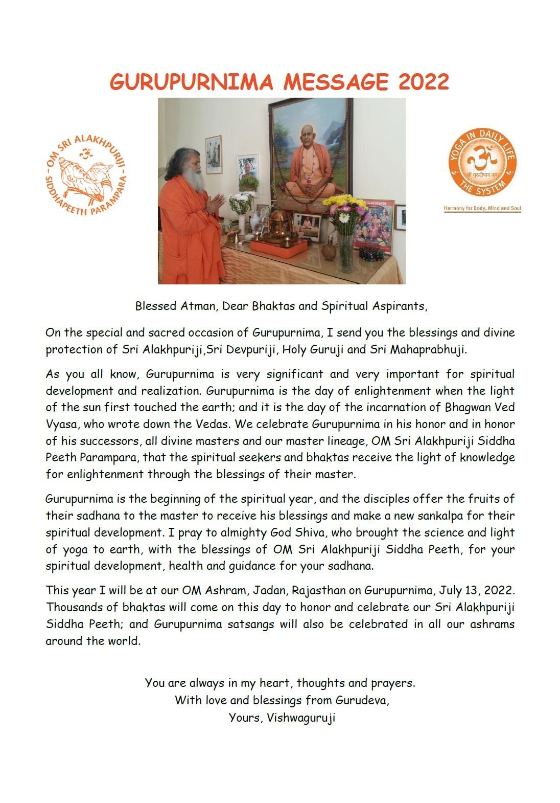 Cu ocazia specială și sacră de Gurupurnima, vă trimit binecuvântările și protecția divină a lui Sri Alakhpurji, Sri Devpuriji, Holy Guruji și Sri Mahaprabhuji. După cum știți cu toții, Gurupurnima este foarte semnificativă și foarte importantă pentru dezvoltarea și realizarea spirituală........